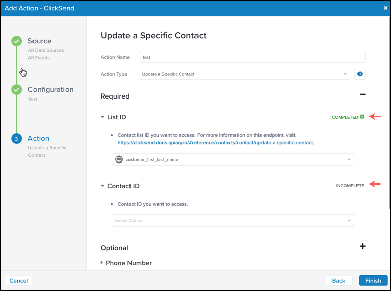 コネクターのアクションを構成するとき、各必要なアクションの右側にあるステータスインジケーターがCOMPLETEDまたはINCOMPLETEを表示し、次に進む前の完全性のクイックビューを提供します。オプションのアクションはこのステータスを表示しません。