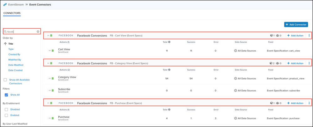 コネクターのランディングページから、新しいコネクターを追加して構成し、既存のコネクターのアクションを表示および編集し、成功とエラーのカウントのリアルタイムレポートを表示することができます。