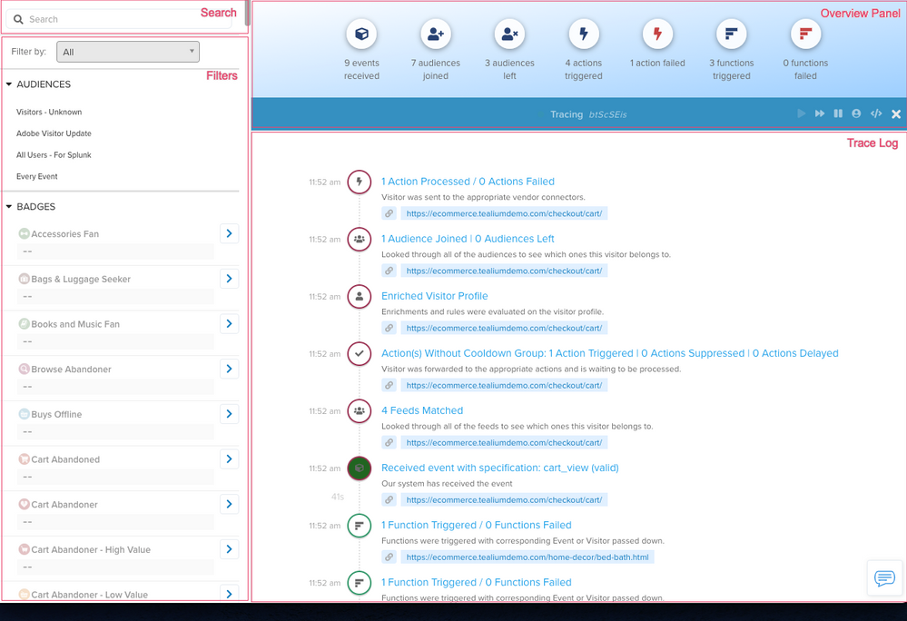 以下の画像は、トレースインターフェースの部分を示しています。Trace Logは、アクション、イベント、オーディエンスのリアルタイムのスクロールサマリーです。Overview Panelは、詳細なアクティビティのスナップショットを表示します。Searchは、訪問と訪問スコープの属性のリストの中から特定の属性を見つけるために使用できます。リスト内の属性はデータタイプ(Numbers、Datesなど)でグループ化されています。Filtersは、これらの属性をフィルタリングするために使用できます。