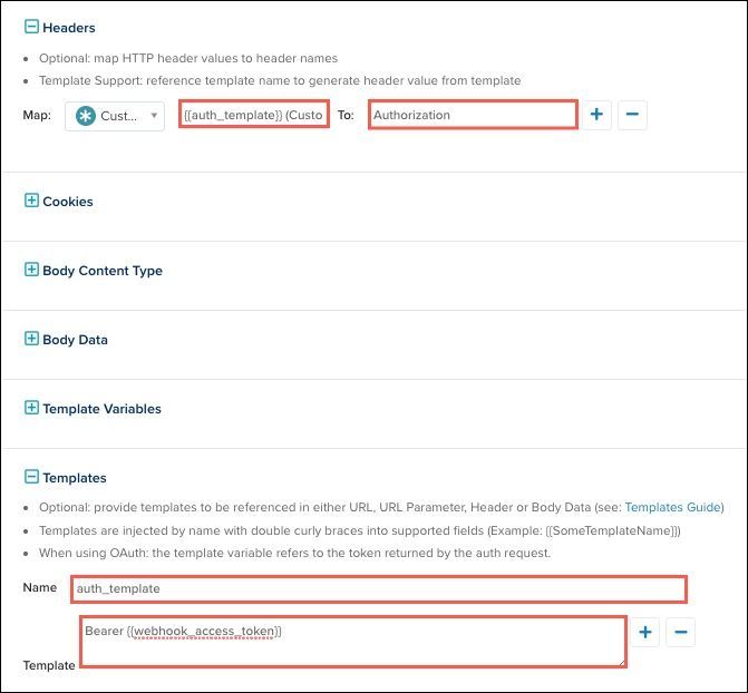 Bearer {{webhook_access_token}} - ヘッダーセクションで、このテンプレートをAuthorizationにマップします。
