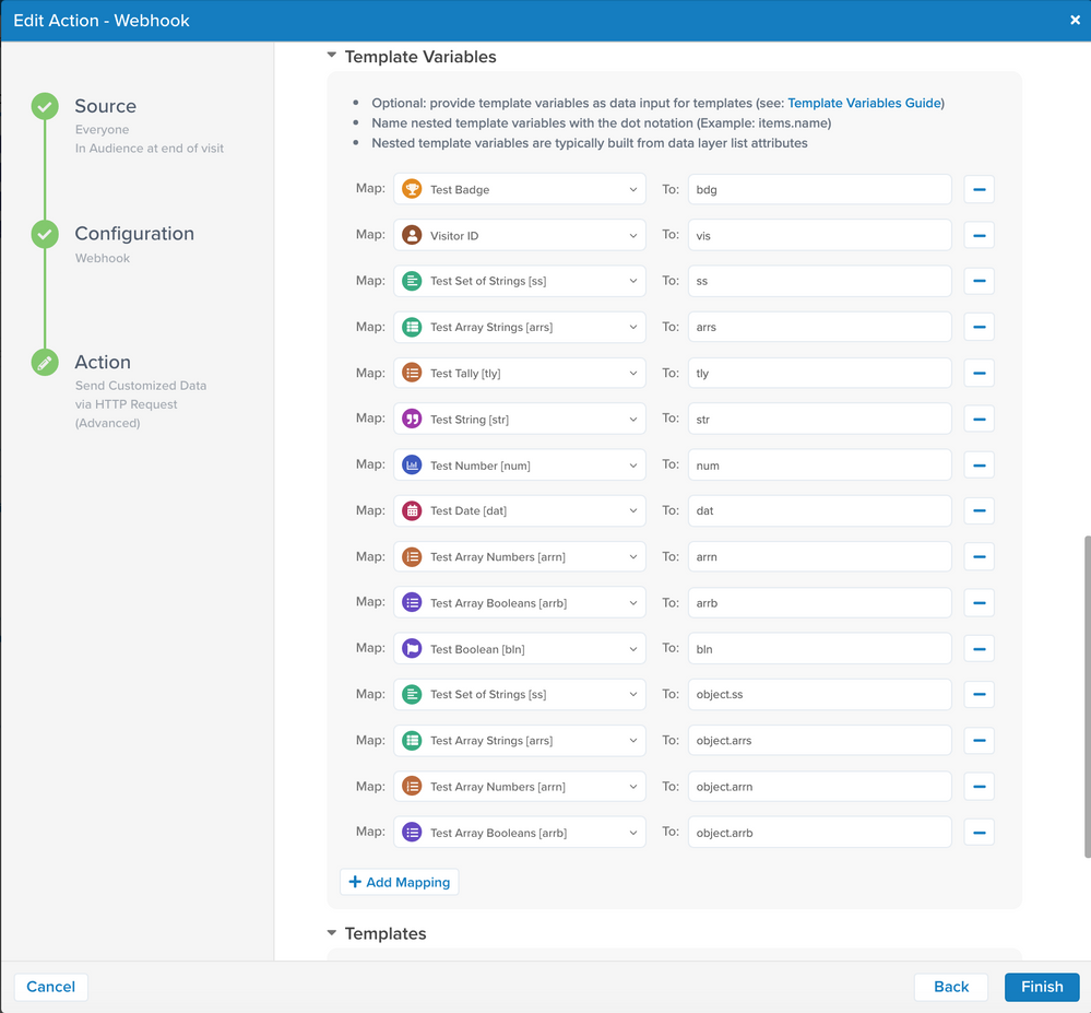 Trimouテンプレートで使用したい入力訪問プロファイルのすべての属性をマップします。マップされた属性の値はTrimouレンダリングエンジンで利用可能になります。