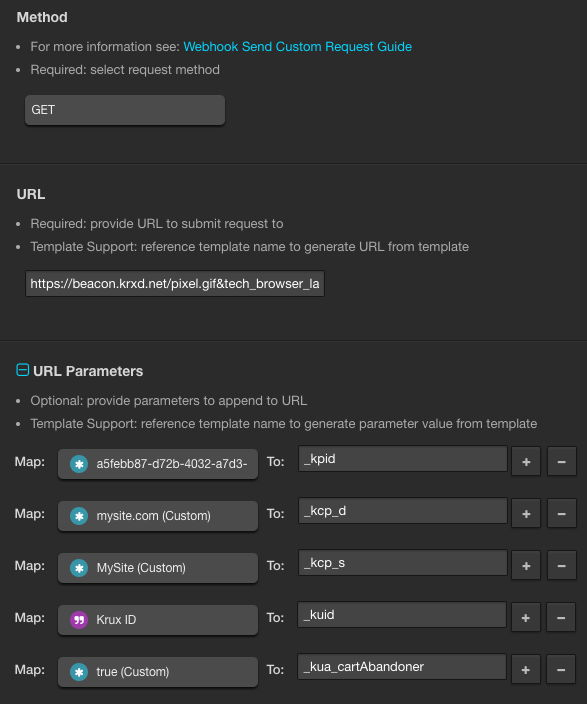 Mapped Attribute Krux Parameter Description <Custom Value> _kpid Publisher UUID (Kruxから提供) <Custom Value> _kcp_d Domain (Kruxから提供) <Custom Value> _kcp_s Site (Kruxから提供) Krux ID _kuid Krux ID Visitor Attribute <Custom Value> kua<krux_user attribute_name> Kruxで構成されたカスタムユーザー属性 (例: _kua_cartAbandoner)
