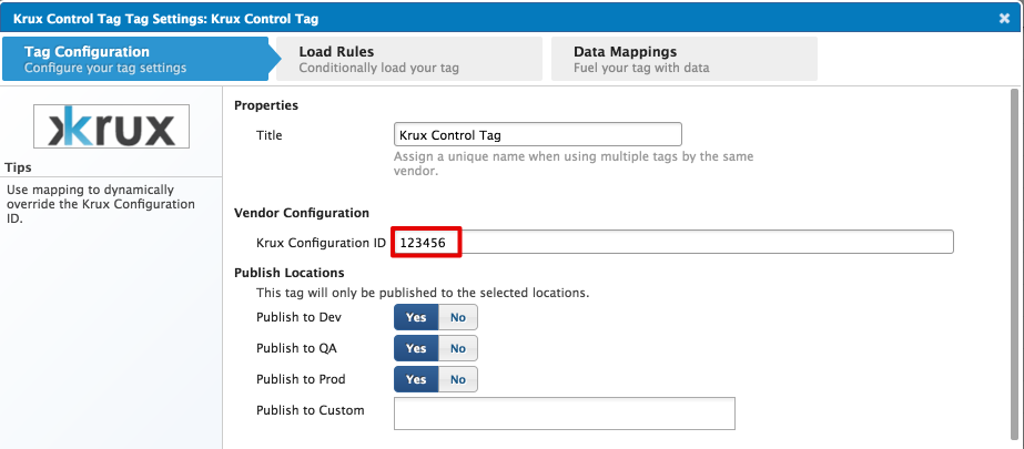 iQタグ管理のTag MarketplaceからKrux Controlタグを追加します。Kruxから提供されたKrux Configuration IDでタグを構成します。