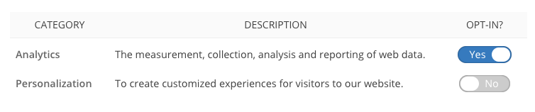 同意構成マネージャーは、タグをその機能と目的に基づいてカテゴリに分けます。これらのカテゴリは訪問に提示され、トラッキングを許可するか否かを切り替えるボタンとして表示されます。