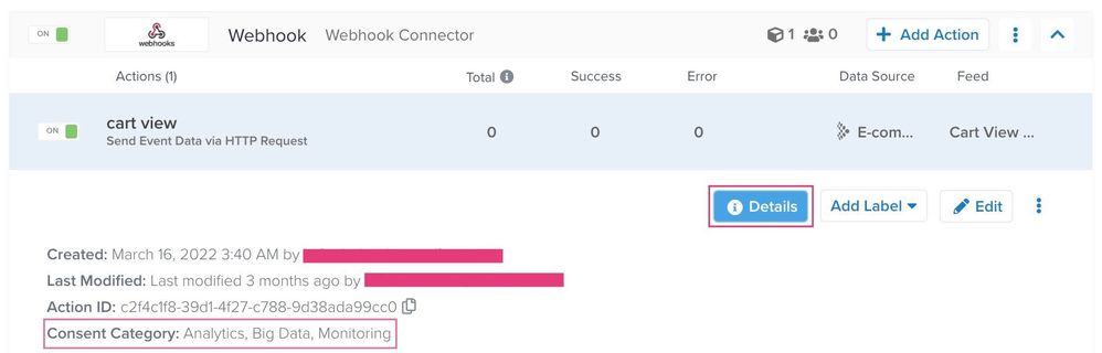 同意構成はEventStreamコネクタによって強制されます。コネクタアクションの同意カテゴリは、アクション構成画面の詳細に表示されます: