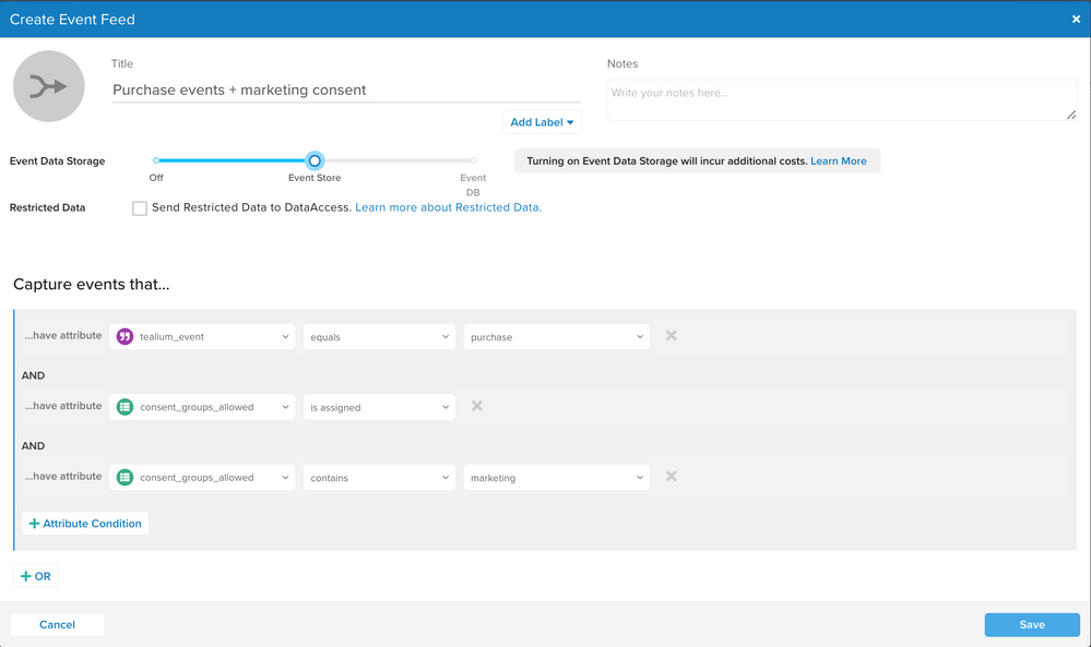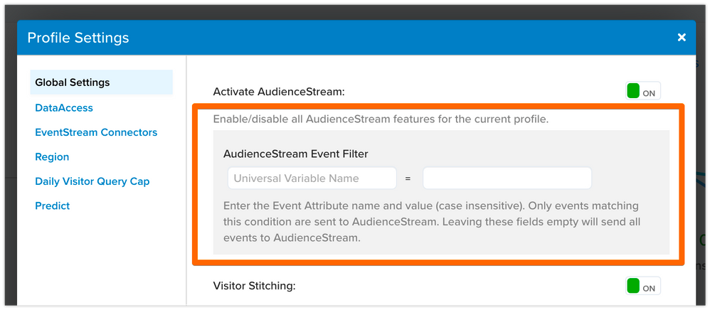 プロファイル自体が一部のケースでブロックされるようにポリシーが要求している場合、AudienceStream Event Filterで使用するための別の文字列属性を構成できます。例えば、has_audiencestream_consentという新しいイベント文字列属性を構成し、デフォルトでfalseに構成し、訪問が適切に同意したとき(イベントレベルのconsent attributesに基づいて)trueに変更します。
