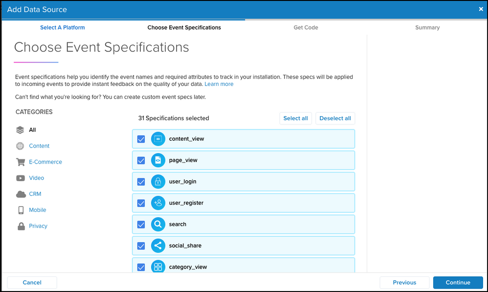 ウェブ、モバイル、サーバーサイド、またはウェブフックのデータソースを追加するには、プラットフォームを選択し、追跡したいイベントを選択(イベント仕様)、そしてインストール用のコードを取得する、の3つのステップが必要です。