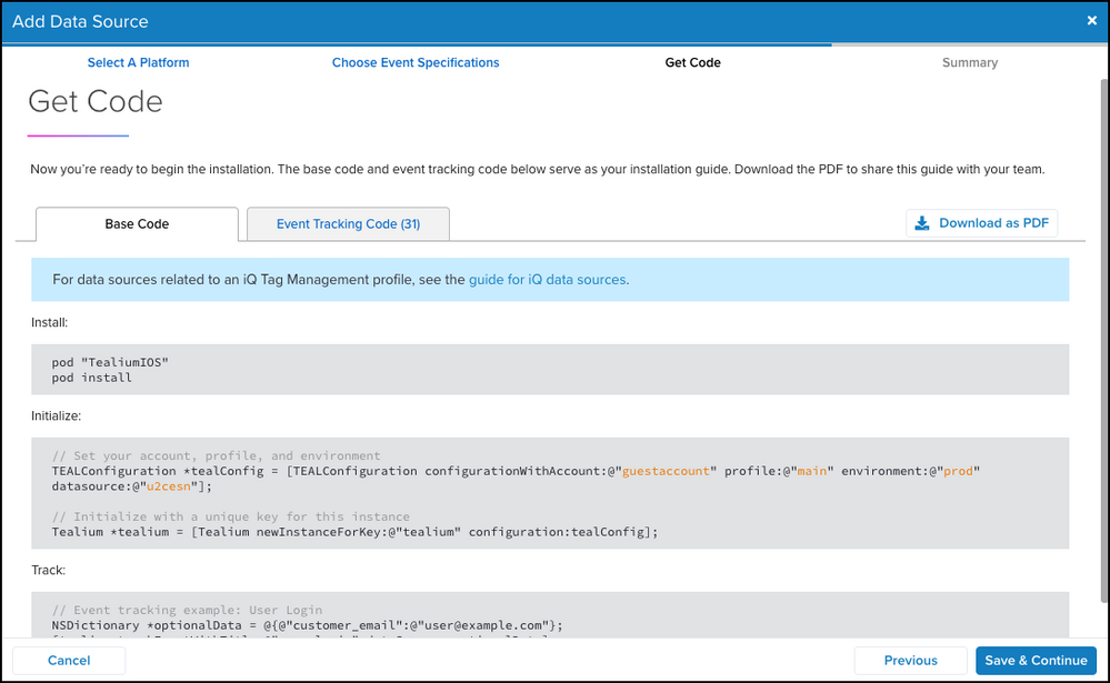 - オプション。データソースキー、ベースコード、イベント追跡コードを含むインストール指示をダウンロードするには、Download as PDFをクリックします。