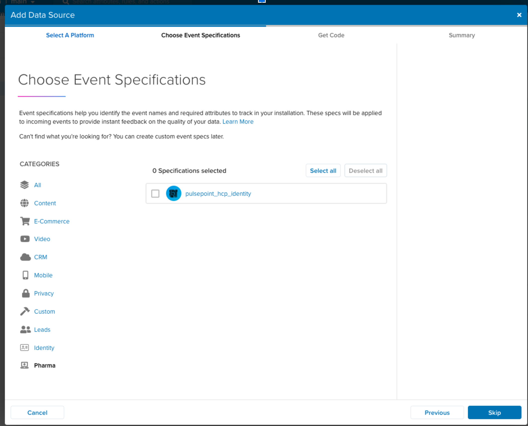 pulsepoint_hcp_identityイベント仕様を選択し、Continueをクリックします: