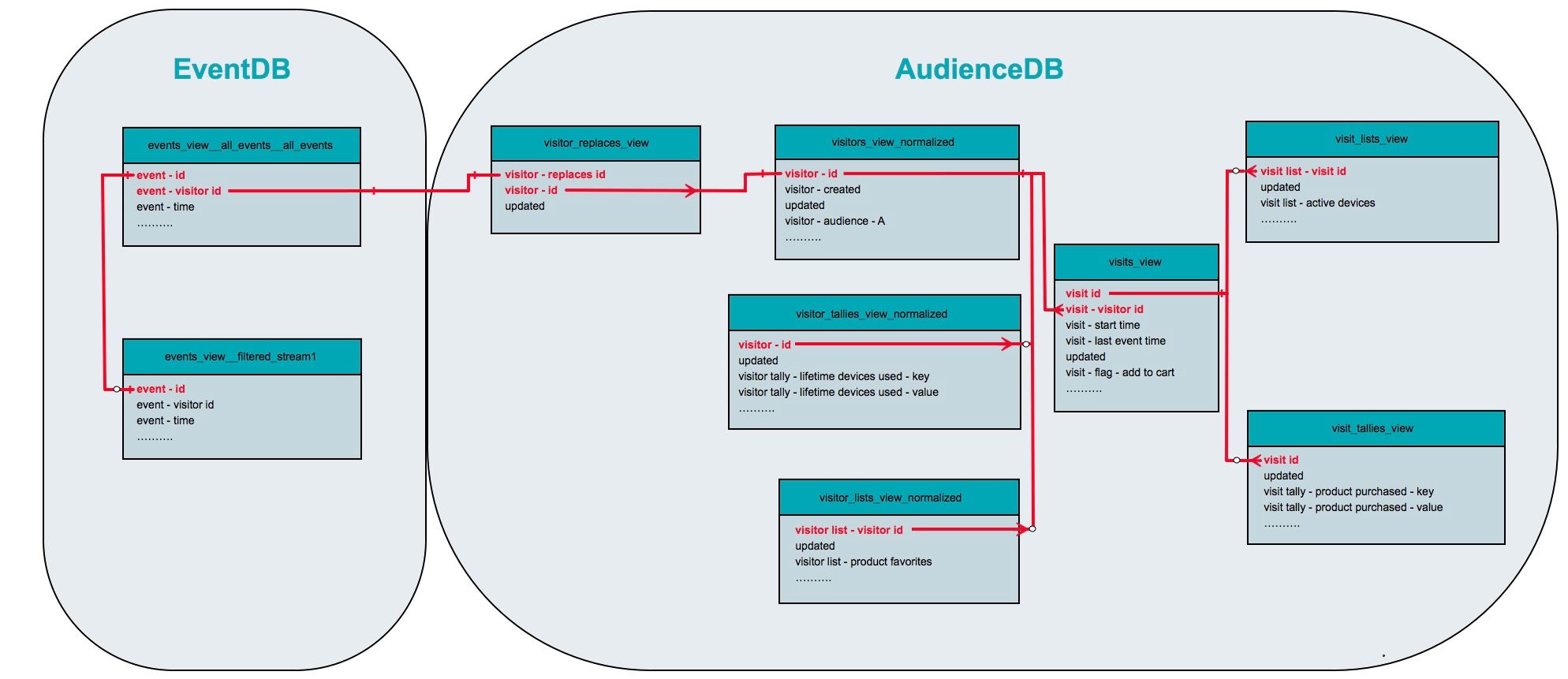 Event、visitor、およびvisit属性は、EventDBとAudienceDBで連携して動作します。次のダイアグラムは、EventDBとAudienceDBの属性間の関係を示しています。これらの関係は、特定の訪問または訪問のイベントデータを返すクエリを作成する際に重要です。