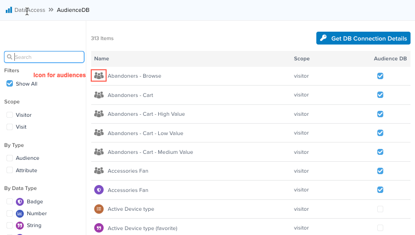 Scope、Type、またはData Typeで属性のリストをフィルタリングできます。 - 必要に応じてオーディエンスの選択を解除して、AudienceDBから削除します。