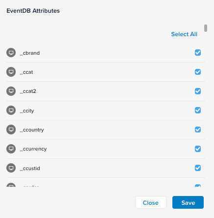 アカウントで利用可能なイベント属性のリストが表示されます。Restricted Dataとマークされた属性はデフォルトで除外されますが、チェックボックスをチェックして含めることができます。