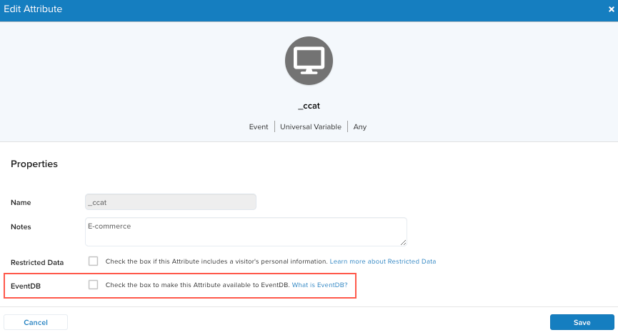 データストレージは属性レベルで制御されます。イベント属性、訪問属性、訪問属性を作成するときに、属性をEventDBまたはAudienceDBに送信するオプションを選択できます。