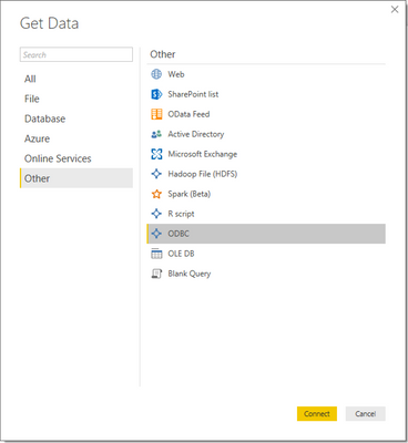 - Otherを選択し、次にODBCを選択し、Connectをクリックします。