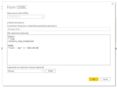 - データベース全体を取得すると、接続後にクエリを正常に実行できない場合があります。Advanced optionsをクリックし、SQLステートメント(オプション)フィールドに制限ステートメントを入力して、必要なデータのみを取得することをお勧めします。次のようになるはずです: