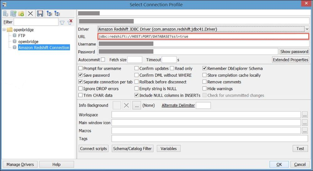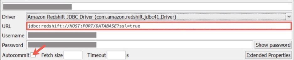 HOST、PORT、DATABASEはDataAccessからの接続値で置き換えます:jdbc:redshift://HOST:PORT/DATABASE?ssl=true。