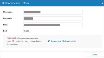 DB Connection Detailダイアログが表示されます。このウィンドウを開いたままにしておきます。以下の例では、機密情報を保護するために資格情報は削除されています。