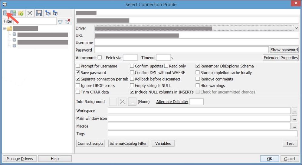 - SQL Workbench/Jのインターフェースで、Create a new connection profileアイコンをクリックします。