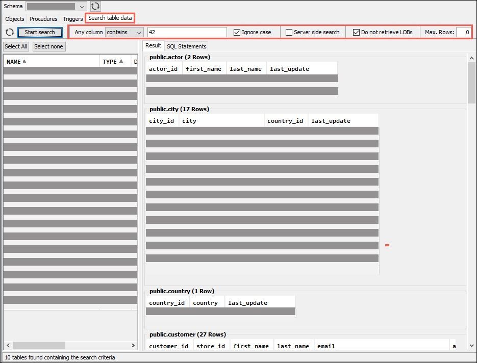 Search table dataタブをクリックして、データのランダムなサンプルを表示できます。インターフェース内の利用可能なフィルタを使用して結果を細かく調整できます。