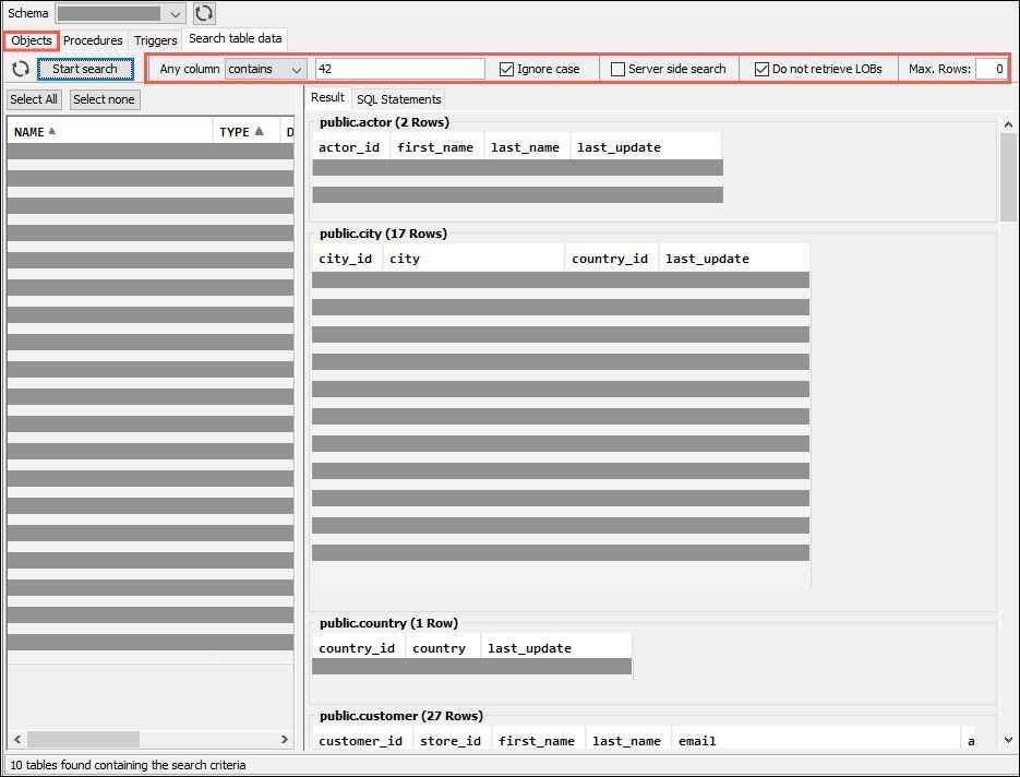 Objectsタブをクリックして、各テーブルまたはビューの列名を表示できます。インターフェース内の利用可能なフィルタを使用して結果を細かく調整できます。デフォルトでは、COLUMN_NAMEはアルファベット順に並んでいません。名前をアルファベット順に並べ替えるには、ヘッダ行をクリックします。