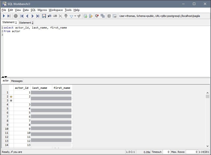 SQL Workbench/Jのインターフェースから、StatementsタブをクリックしてSQLステートメントを作成し、結果やエラーメッセージを表示できます。