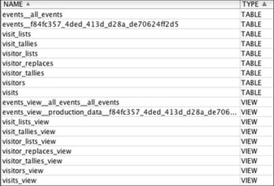 visit_listsは、クエリに使用する現在の訪問スコープのリスト属性を保持します。visit_talliesは、クエリに使用する現在の訪問スコープの集計属性を保持します。visitor_listsは、クエリに使用する訪問スコープのリスト属性を保持します。visitor_talliesは、クエリに使用する訪問スコープの集計属性を保持します。visitor_replacesは、ステッチされた訪問プロファイルを保持します。visitorsは最も一般的に使用されるテーブルであり、各訪問と所属するオーディエンスの最新の訪問スコープのデータを保持します。visitsは、各訪問の最新の現在の訪問スコープのデータを保持します。