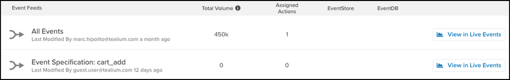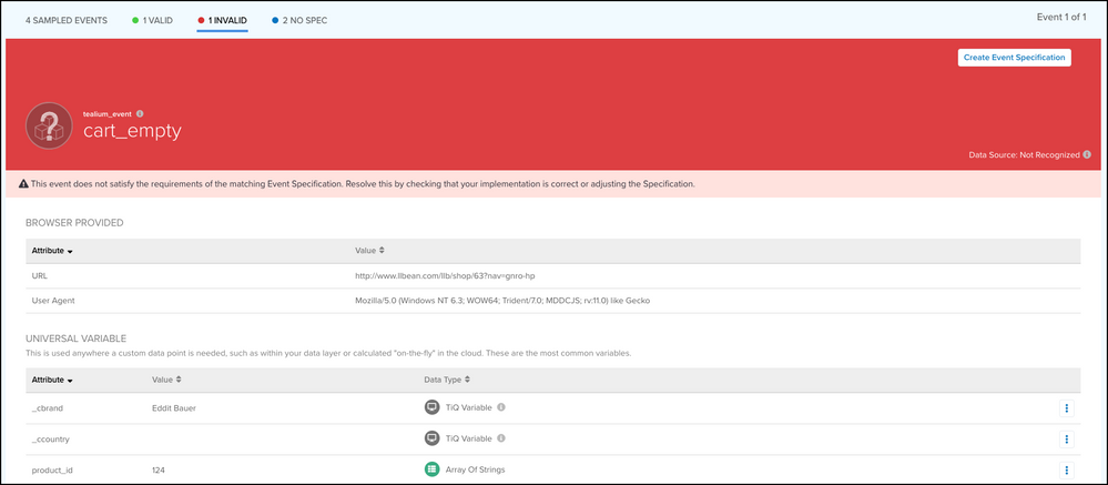 イベント仕様が作成され、トラッキングコードが実装されたら、Live Eventsを使用してリアルタイムで入力イベントを表示し、そのデータ品質を評価します。イベントがCustomer Data Hubに到着すると、tealium_event属性がイベント仕様と一致すると、入力属性は仕様の要件と比較され、有効または無効とマークされます。