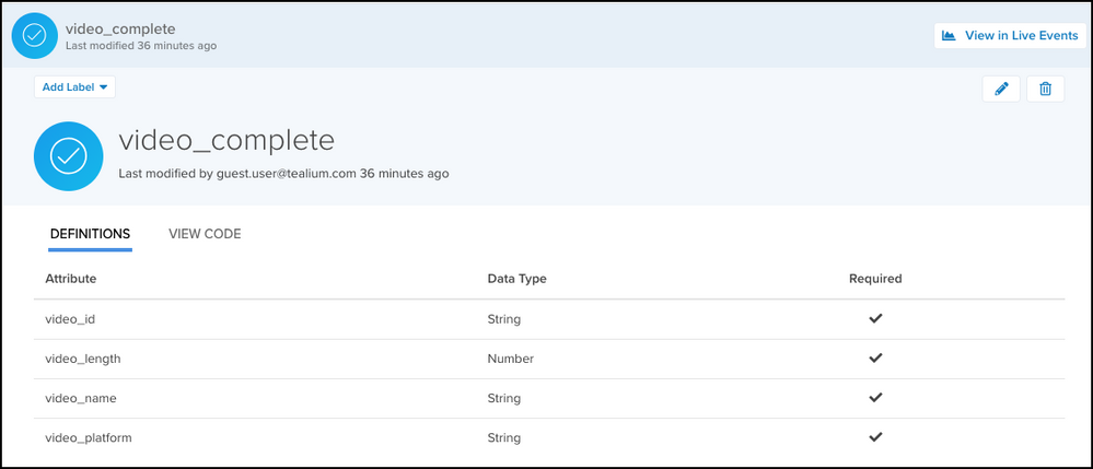 tealium_event属性はイベントの種類を識別します。この場合はvideo_completeです。追加の属性はイベントに関する文脈情報を提供し、対応するイベント仕様は必要な属性とそれらの予想されるデータ型を定義します。以下の例を参照してください。