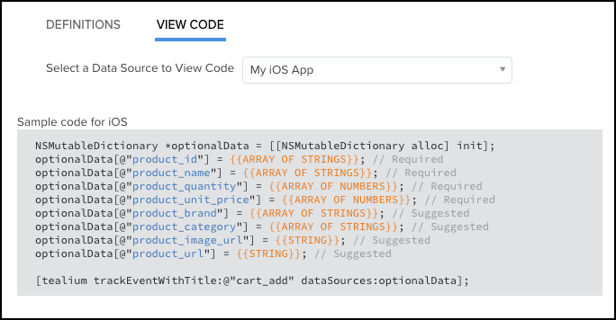 iQ Tag ManagementデータソースMy iOS Appのcart_addイベントのトラッキングコード: