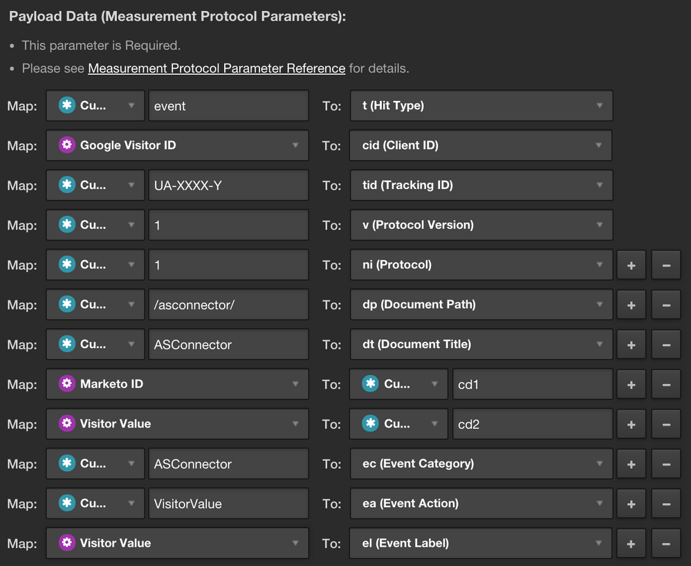 | cd1=id:123-ABC-456&token:_mch-site.com-123456-789 | カスタムディメンション1の値。このシナリオでは、theMarketoID です。 |