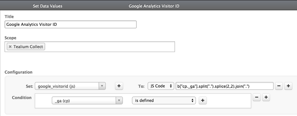 WebhookからGoogle Analyticsに正しくヒットを保存するためには、Google Analyticsの訪問IDをWebhookで提供する必要があります。これは、Tealium iQを使用してクッキー _ga を解析し、クッキー値の末尾の2つの最長の数字をデータレイヤー変数に格納することで行われます。_ga を First Party Cookie タイプ、google_visitorid を UDO Variable タイプとして Data Layer タブで宣言します。次に、以下のように Set Data Values extension を作成します。