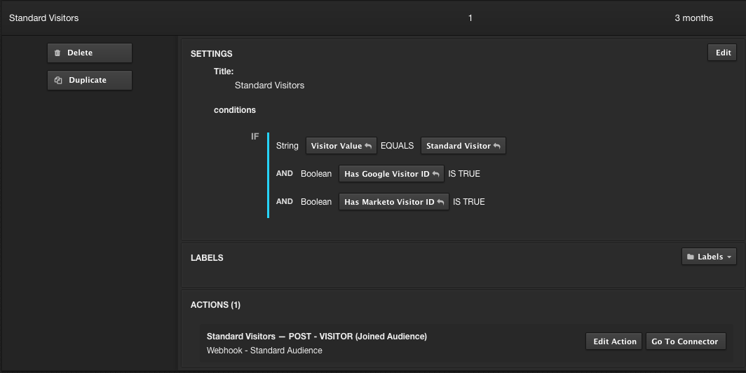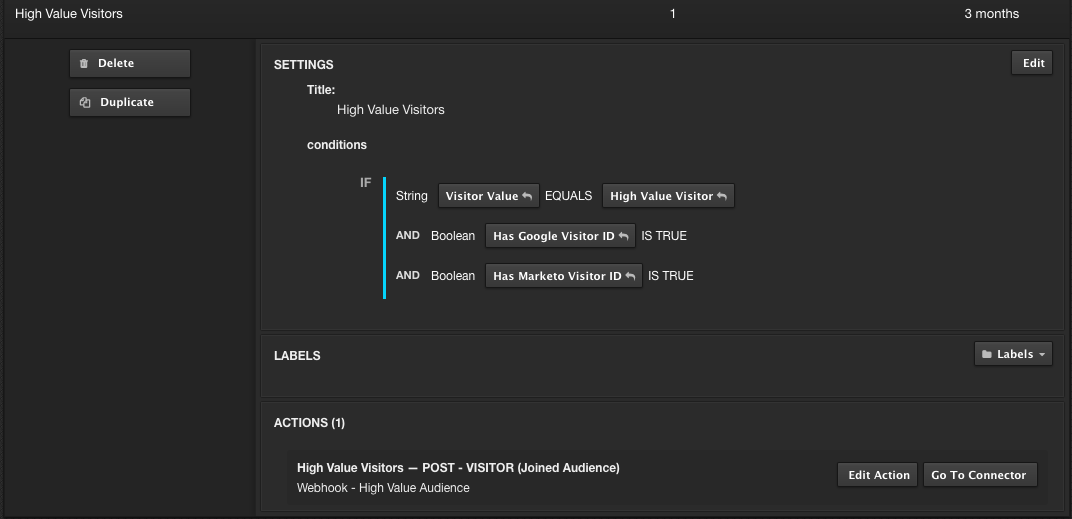 2つのコネクタが構成されます。それぞれのコネクタは、訪問が 標準の訪問 または 高価値の訪問 のオーディエンスに参加または変更したときに発火します。