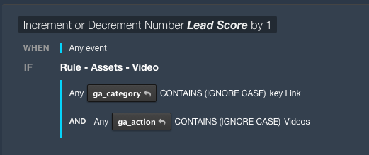 このユースケースでは、Javascript Code extension を使用して、jQueryを使用してすべてのイベントをキャプチャすることを選択しました。このユースケースのポジティブなイベントのいくつかの例は、ケーススタディ、ホワイトペーパー、ビデオ、ウェビナーなどのアセットとの相互作用です。また、サポートなどのネガティブなイベントも含まれており、これによってリードスコアが値を減算するかゼロにリセットされます。