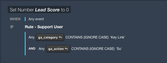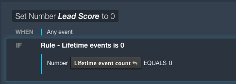すべての新しい訪問の リードスコア をゼロに初期化します。これは、Lifetime Event Count Number を使用してゼロかどうかをチェックすることで行われます。