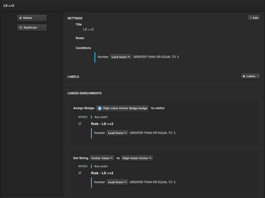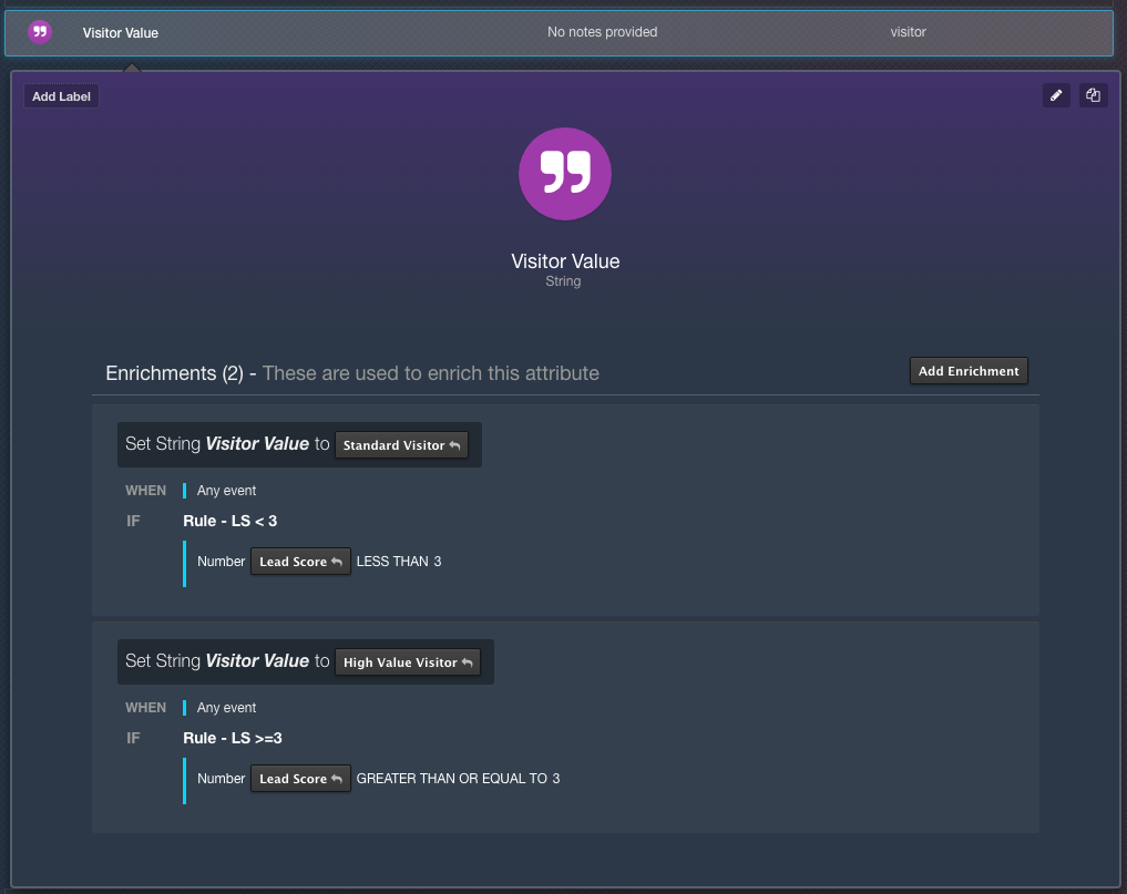 リードスコア > 3 または リードスコア >= 3。これらは次にVisitor Value Stringを割り当てるために使用されます。