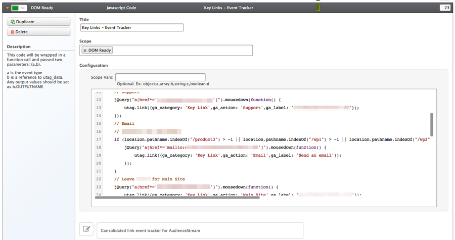 AudienceStreamでリードスコアメトリクスを調整するために、Tealium iQでイベントを構成します。これは通常、特定のウェブサイトのアセットがクリックされたり相互作用したりしたときに、utag.link() を呼び出すことを含みます。このステップでは、jQueryの onHandler() 拡張機能またはJavaScriptコード拡張機能を使用してこれらのイベントをキャプチャするオプションがあります。これらは、どちらもデータをGoogle AnalyticsとAudienceStreamに送信します。