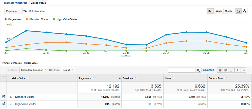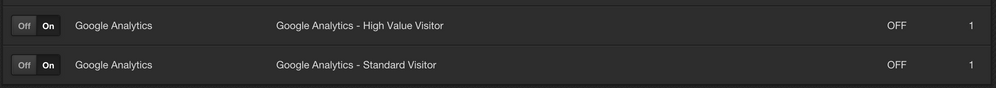 すべての新しい訪問は、最初のページビューでコネクタを発火して 標準の訪問 としてフラグを立てます。この最初のコネクタは必ず発火する必要があります。なぜなら、Google Analyticsはカスタムディメンションに自動的に NULL の値を割り当てないからです。カスタムディメンションにデフォルト値が必要な場合は、いくつかの値でポピュレートする必要があります。訪問が後で 高価値の訪問 オーディエンスに参加する場合、2番目のコネクタが発火して彼らを 高価値の訪問 にアップグレードします。その訪問がそのオーディエンスを離れて 標準の訪問 オーディエンスに再参加する場合、コネクタは再び発火します。