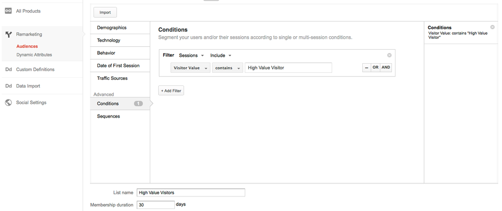 訪問の値 が 高価値の訪問 の場合、訪問はこのオーディエンスのメンバーです。