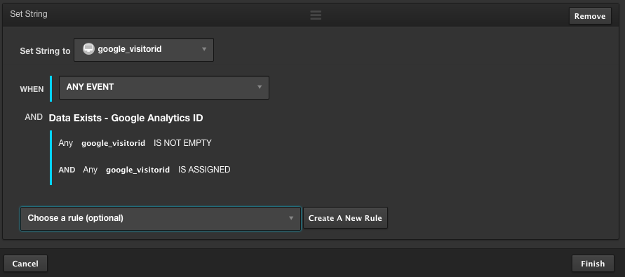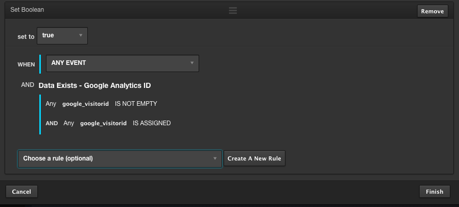 データが存在するかどうかをチェックするために、Booleanを構成します。これは、google_visitorid に保存された値がWebhookから受け取ったデータをGoogle Analyticsに保存するために必要です。