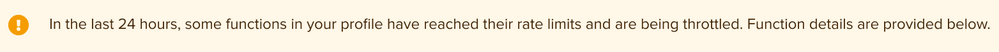 いずれかの制限を超えると、関数の実行が一時的に停止(スロットル)されます。以下のメッセージが関数概要に表示され、スロットルされた関数の隣には黄色の警告アイコンが表示されます: