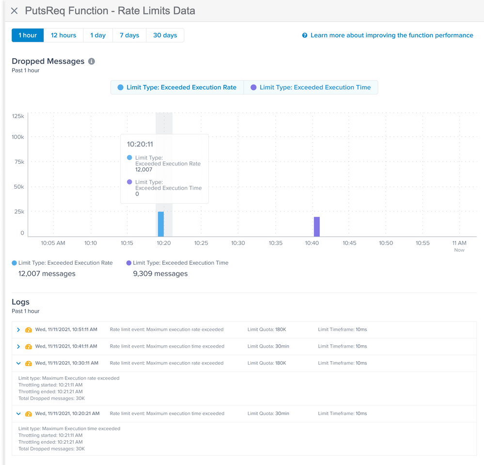 コードエディタのモニタリングタブでは、すべての関数タイプの実行統計を表示できます。また、スロットルされたデータ変換関数についての詳細情報も表示できます。
