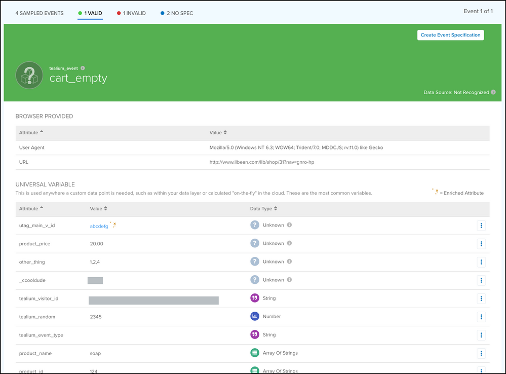 「Invalid」なイベントは、イベント仕様と一致しますが、必要な属性がありません。これは、イベントがtealium_event属性の既知の値を持っているが、必要な属性が欠けているか、属性が予期しない値を含んでいることを意味します。これらの問題は、イベントを送信しているインストールコードを修正することで解決できます。また、場合によっては、イベント仕様を調整することで解決できます。 - No Spec