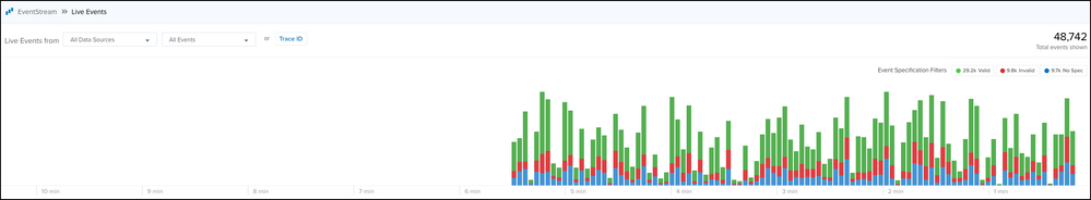 ライブイベントは、チャートに表示されるリアルタイムの入力データを表示します。チャートは、すべてのデータソースとすべてのイベントフィードからのイベントを表示します。チャートの各バーの高さは、検出されたイベントの量を示します。バーをクリックすると、そのイベントの一部の詳細を検査できます。アクティブなイベント仕様がある場合、チャートは有効なイベントと無効なイベントをそれぞれ緑と赤のセグメントで表示し、入力データの品質を反映します。