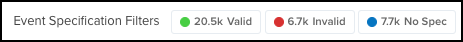 イベント仕様が定義されている場合、ライブイベントは入力データの品質を表示します。チャートの各バーは、適用されたイベント仕様のステータスに応じてセグメント化されます。以下のフィルタは、チャートの表示を調整するためにオンまたはオフに切り替えることができます:
