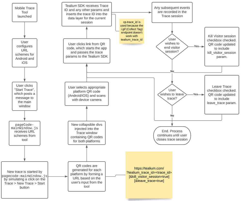 QRコードは各プラットフォーム(AndroidまたはiOS)ごとに生成されます。適切なモバイルデバイスのカメラで適切なQRコードをスキャンした後、QRコードからのリンクをクリックしてアプリを起動し、トレースパラメータをTealium SDKに渡します。Tealium SDKはトレースID(および他のパラメータ)を受け取り、現在のセッションのデータレイヤーにトレースIDを挿入します。