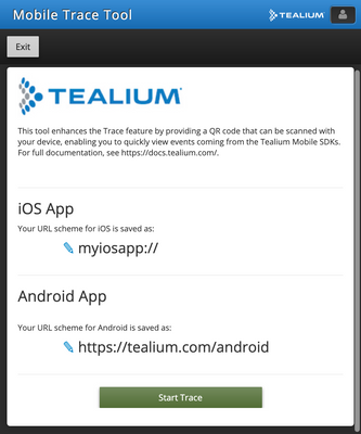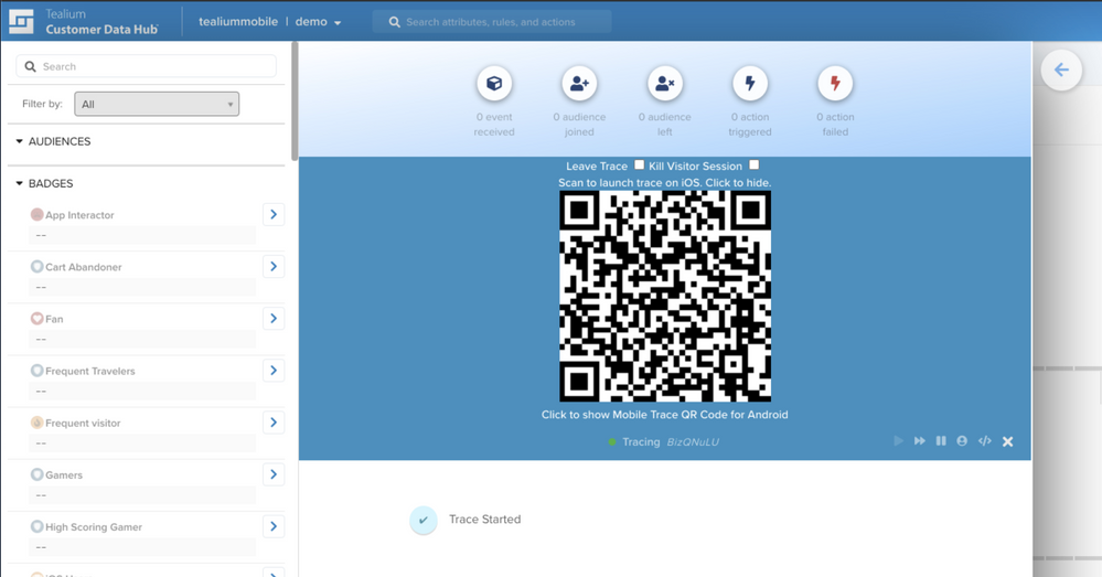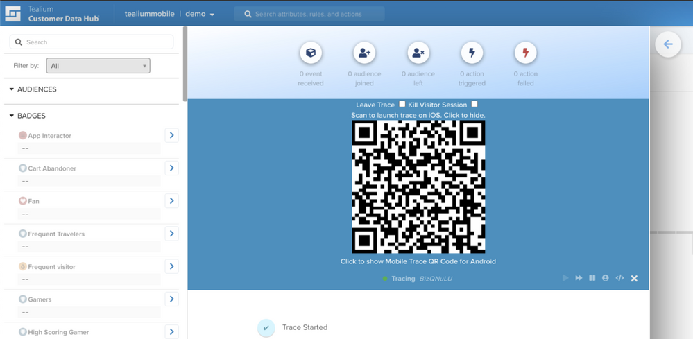 次のトレースはCustomer Data Hubから直接開始され、新しいトレースが開始するたびにQRコードが自動的に更新されます。デバイスのカメラでQRコードをスキャンし、リンクをクリックしてアプリを起動し、自動的にトレーシングを開始します。トレースに参加した後にアプリが生成したTealiumイベントはすべて、あなたのトレースセッションに記録されます。