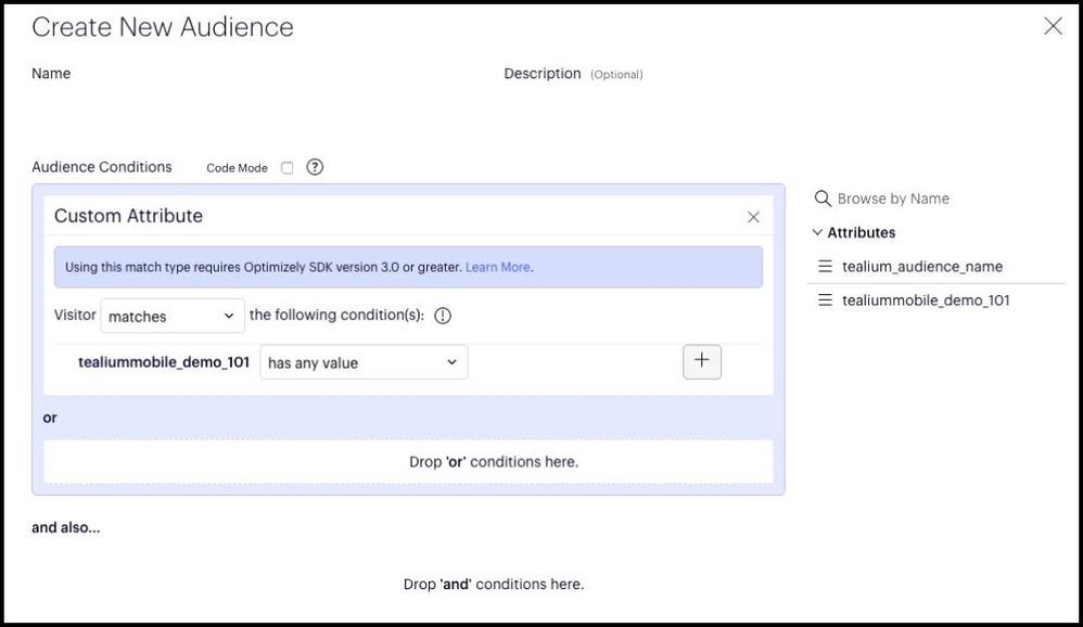 Tealiumのオーディエンスやバッジを対象としたフィーチャーフラグ/フィーチャー実験または実験をターゲットにするために、Optimizely Full Stackインターフェース内でTealiumのオーディエンスとバッジごとに1つの"属性"を作成します。