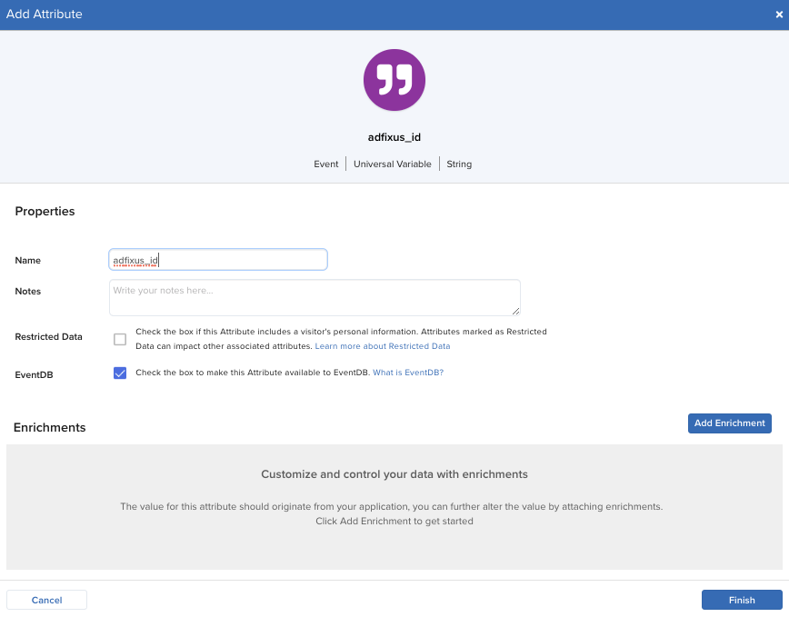- AdFixus IDは、イベント属性の下でユニバーサル変数として表示されます。